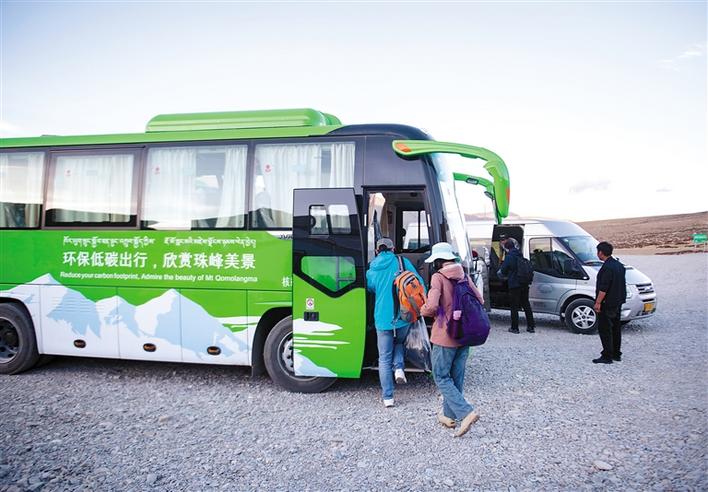 游客在珠穆朗瑪峰景區(qū)停車(chē)場(chǎng)轉(zhuǎn)乘環(huán)??蛙?chē)(2019年5月16日攝)。珠穆朗瑪峰景區(qū)內(nèi)自2019年5月開(kāi)始試運(yùn)營(yíng)清潔能源環(huán)保客車(chē),以進(jìn)一步平衡珠峰地區(qū)旅游發(fā)展與環(huán)境保護(hù)需要。新華社記者 孫非 攝