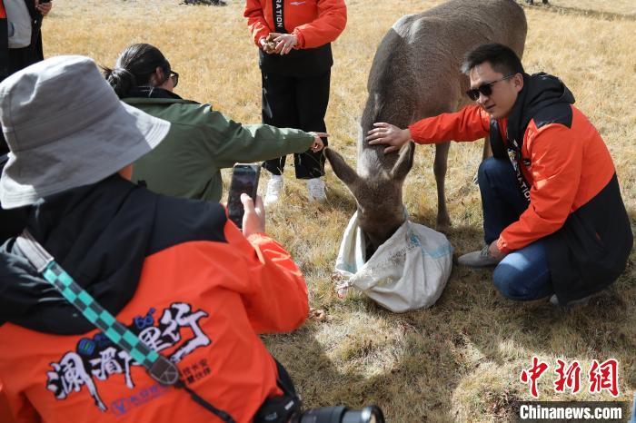 圖為西藏類烏齊馬鹿國家級自然保護區(qū)的管護員正在飼喂馬鹿?!∪轿木?攝