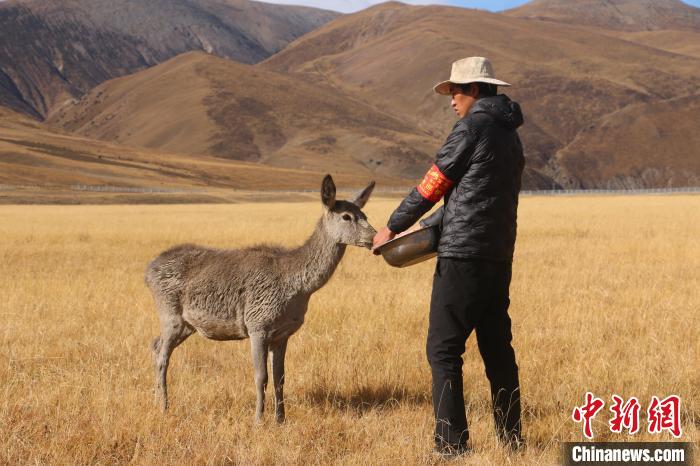 圖為西藏類烏齊馬鹿國家級自然保護區(qū)的管護員正在飼喂馬鹿。 冉文娟 攝