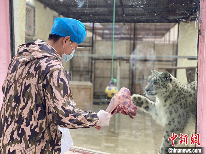 11月5日,史壽軍拿著羊腿與雪豹隔著玻璃互動(dòng)。 中新社記者 李江寧 攝