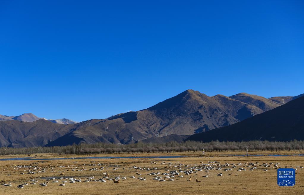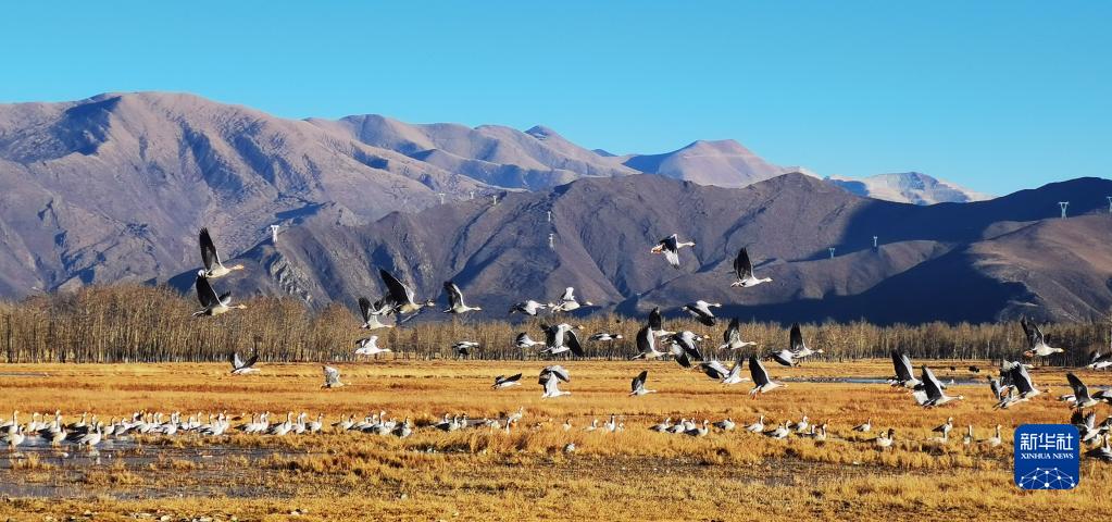 唐嘎鄉(xiāng)位于拉薩市達(dá)孜區(qū)東北部,這里每年冬季都會(huì)迎來(lái)黑頸鶴、斑頭雁、赤麻鴨等候鳥。這些在此越冬的“客人”和周邊的田園、濕地共同構(gòu)成高原冬季美景。