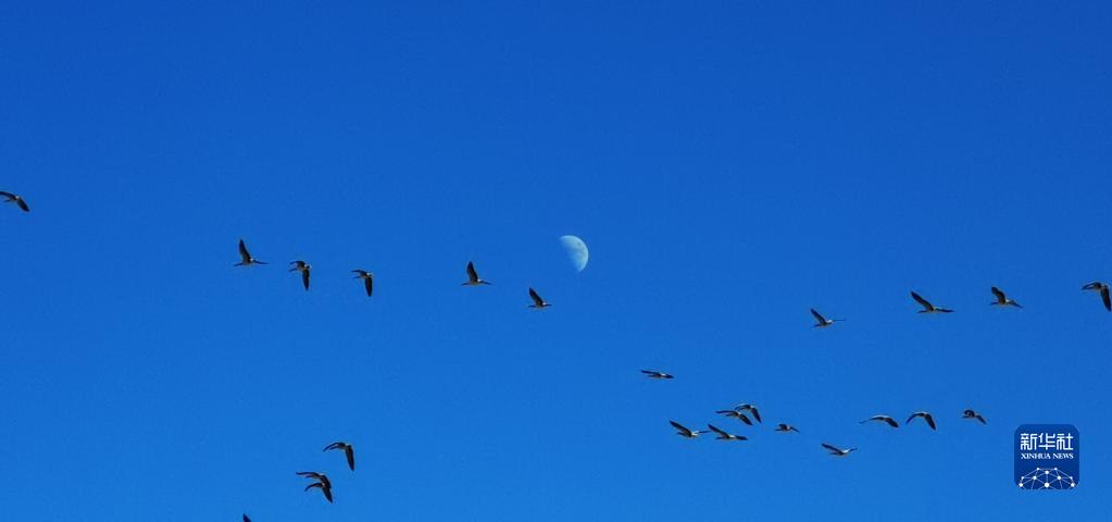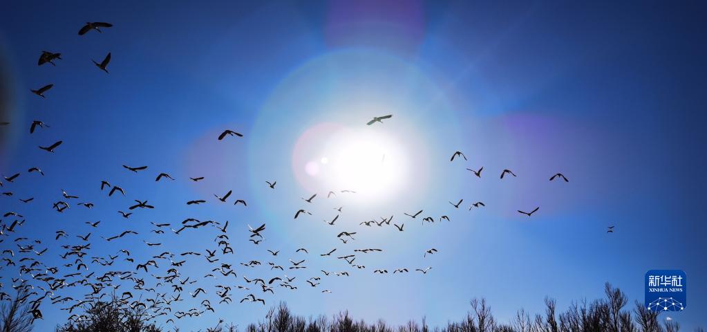 候鳥飛過(guò)唐嘎濕地(12月11日攝,手機(jī)照片)。新華社記者 沈虹冰 攝