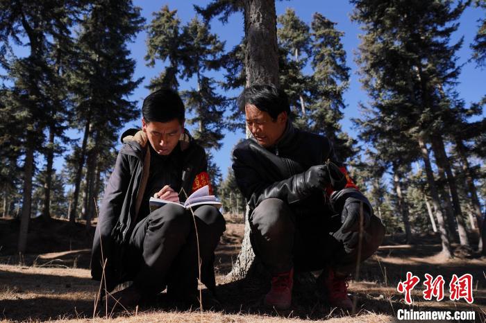 “每天和同事至少要巡護(hù)兩趟。早些年從管護(hù)站到林場只能靠步行,早晨天不亮就出發(fā)。現(xiàn)在,每次巡邏都能和會騎摩托車的同事一起,方便多了。”桑杰加沿著蜿蜒的小路,往林場深處走去,巡護(hù)中,看見一棵樹體上有大片樹皮開裂,桑杰加立即上前檢查是否有凍害、蟲口等。