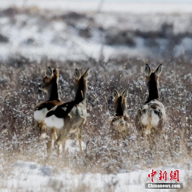 近日,在甘肅張掖,一場降雪過后,祁連山下的山丹軍馬場白雪覆蓋大地。初春的山丹馬場,被一層薄薄的春雪覆蓋,雪原之上,狍鹿們開啟了它們的“狂歡模式”,盡情嬉戲打鬧,肆意撒歡奔跑。隨處可見的狍鹿或吃草、或撒歡、或靜臥,展現(xiàn)出一幅幅人與自然和諧共生的動(dòng)人畫面。 郭正賢 攝