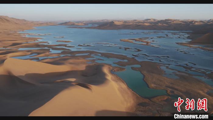 位于庫木庫里沙漠腹地的沙子湖薄冰化盡,蔚藍(lán)的湖水與金黃的沙山、遼闊的碧空交相輝映。 尚鵬 攝