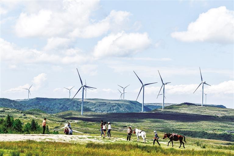 游客在貴州省龍里縣龍里大草原的風電場觀光(2021年9月21日攝)。