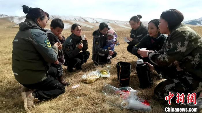 在巡護了一大片林地后,大家聚到一起休息。草原上席地而坐,背著11個月大女兒的索南吉放下孩子,小扎西拿著風(fēng)鈴逗著妹妹。一壺清茶、一袋干糧、兩個孩子,一群女子交流著巡護情況,不時也會傳出開心的笑聲。