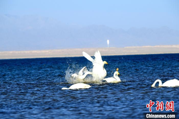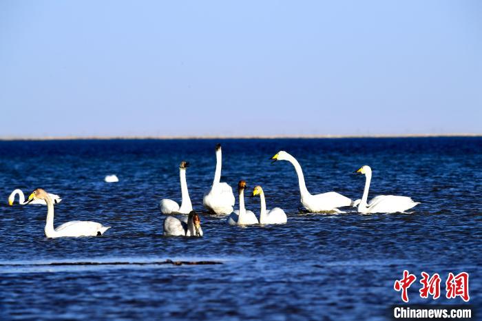 圖為天鵝群在湖中游蕩。 青海多美生態(tài)環(huán)??萍加邢薰?供圖