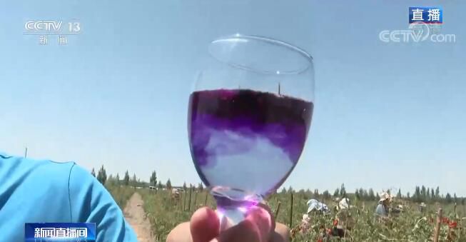 除了紅枸杞之外,這里還種植了15000多畝的有機(jī)黑枸杞,黑枸杞的成熟時(shí)間要遲一些,在8月下旬,所以我現(xiàn)在手里只有黑枸杞干。大家可以看一看,如果我們把它也像紅枸杞一樣泡入水中的話,顏色展開得非??欤瑤酌腌姷臅r(shí)間水就已經(jīng)是藍(lán)紫色了。當(dāng)?shù)氐呢?fù)責(zé)人告訴我,這很大程度是因?yàn)樗幕ㄇ嗨睾扛?,所以黑枸杞也有另外一個(gè)名字,叫作“花青素之王”。