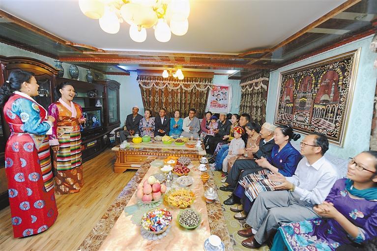 著力創(chuàng)建全國民族團(tuán)結(jié)進(jìn)步模范區(qū)。截至2022年5月,全區(qū)共有國務(wù)院、西藏自治區(qū)表彰的民族團(tuán)結(jié)進(jìn)步模范集體1934個,模范個人2846人。圖為2021年2月13日,西藏自治區(qū)拉薩市吉崩崗社區(qū)各族群眾在同一天共度農(nóng)歷新年和藏歷新年。