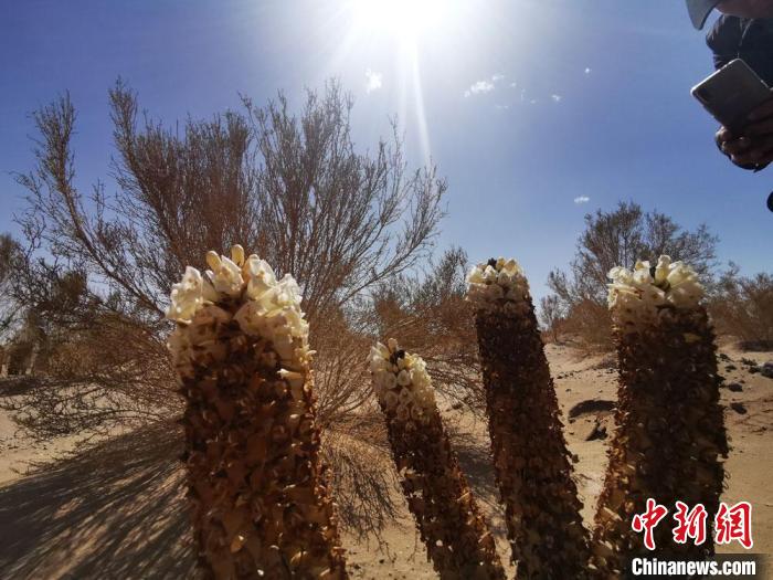 2020年5月16日,甘肅酒泉市金塔縣境內沙漠里,梭梭林下的肉蓯蓉花開?!∫蟠河? 攝