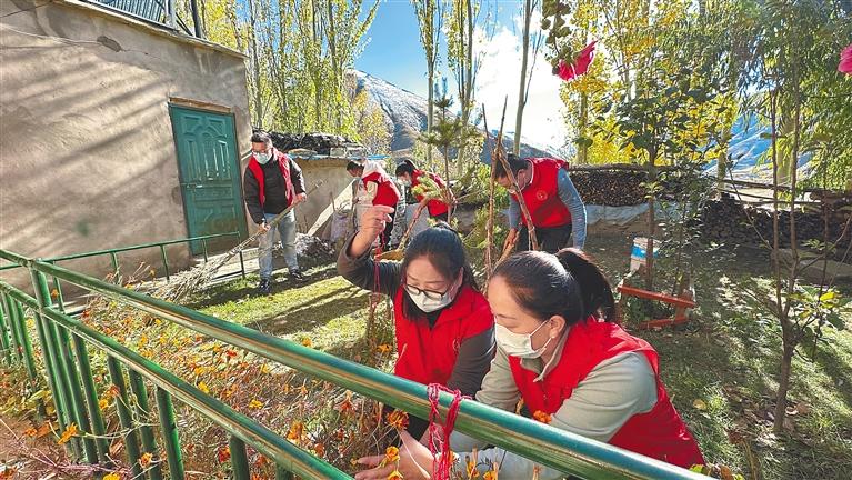圖為黨員干部為白日社區(qū)居民打掃庭院。記者 次旺 通訊員 倫珠澤仁 攝