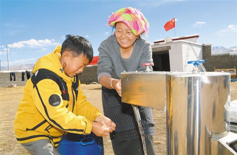 圖為近日,當(dāng)雄縣公塘鄉(xiāng)沖嘎村一組村民拉宗母子在自家院子里用上了干凈、放心的自來水。記者 洛桑 攝