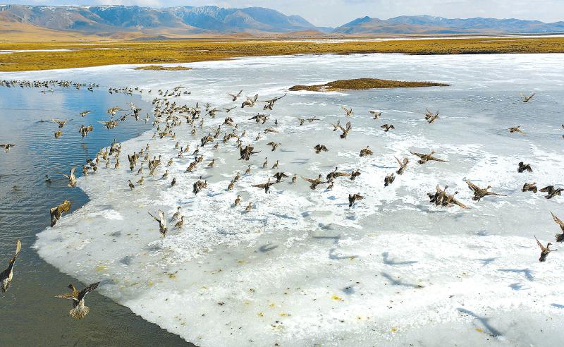 陽(yáng)光下,數(shù)千只珍稀飛禽在光影交錯(cuò)的若爾蓋花湖嬉戲翱翔。尹鋼 攝(資料圖片)