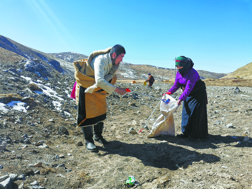 扎西當(dāng)智和牧民一起撿拾垃圾。