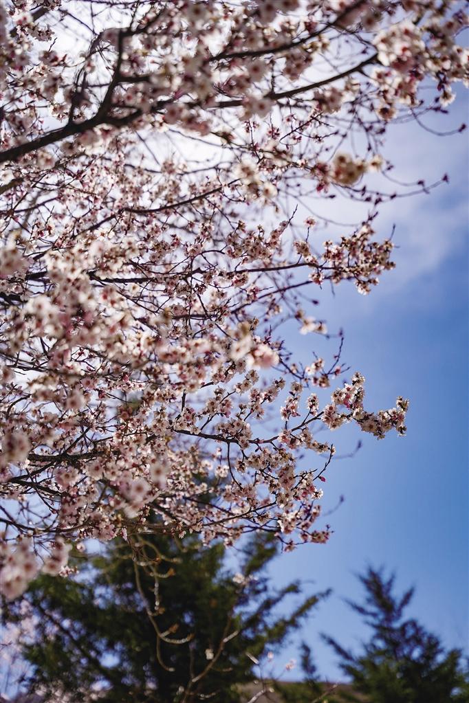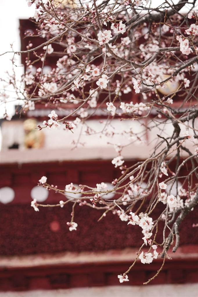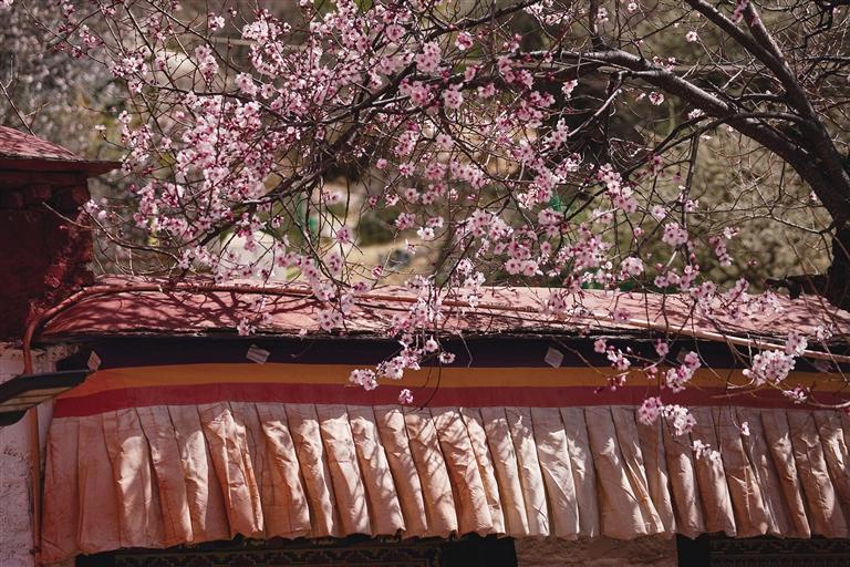 4月的帕邦喀,桃花開得正茂,桃樹枝上早已經(jīng)掛滿了大大小小的花朵,沿著石板臺(tái)階走走停停,可以看到桃樹舒展枝條,朵朵桃花爬上枝頭沐浴著春日的暖陽,在藍(lán)天白云、紅墻金頂?shù)挠骋r之下格外美麗,構(gòu)成一幅絕妙的春景詩畫。偶爾枝頭傳來清脆的鳥鳴聲,讓這里顯得愈發(fā)靜謐美好。