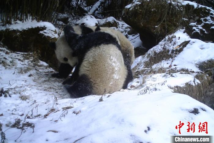 熊貓媽媽教授熊貓寶寶啃、咬、推、擠等動作。 桃花源老河溝保護中心供圖