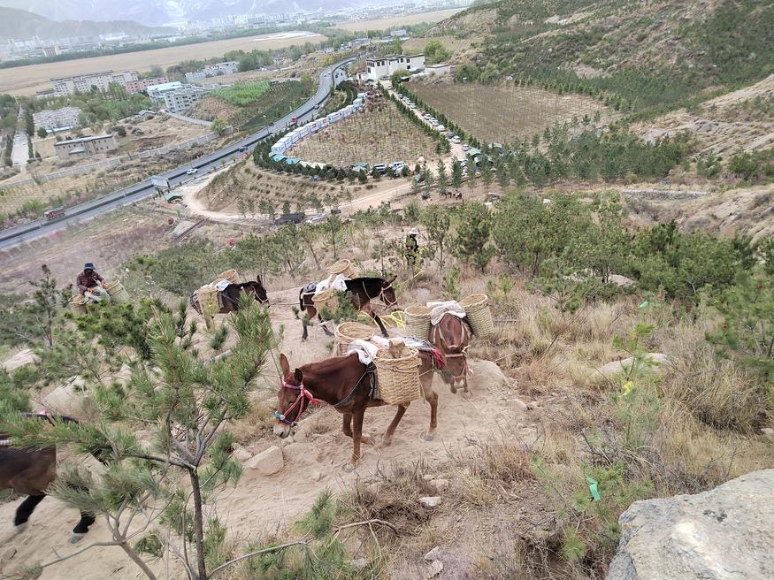 圖為騾隊(duì)在綠化片區(qū)運(yùn)輸樹苗 圖片來源:西藏自治區(qū)慈善總會(huì)官網(wǎng)