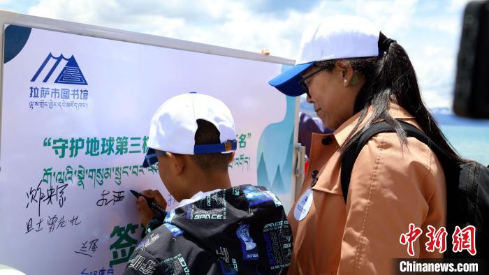 圖為青少年在公益環(huán)保簽名活動(dòng)上簽名。拉薩市圖書(shū)館供圖