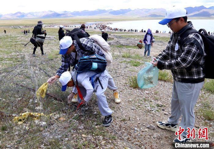 圖為青少年在納木錯(cuò)湖畔撿拾垃圾。拉薩市圖書(shū)館供圖