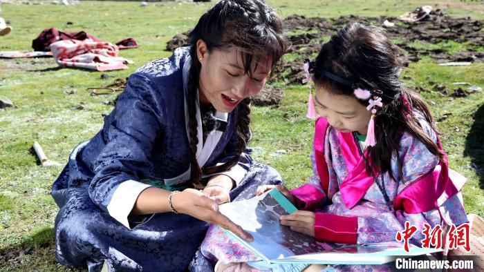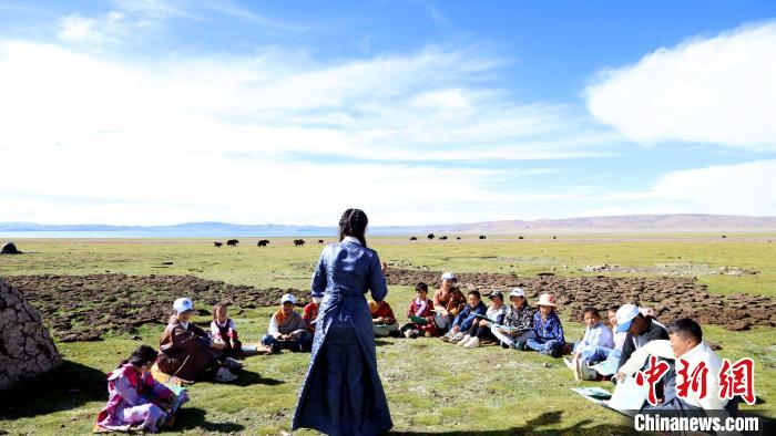 圖為青少年在納木錯(cuò)湖畔的牧區(qū)共同閱讀《牛糞們的愿望》。拉薩市圖書(shū)館供圖