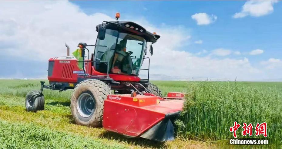 9月以來,位于柴達(dá)木盆地的青海省德令哈市尕海鎮(zhèn)的萬(wàn)畝優(yōu)質(zhì)紫花苜蓿迎來收獲季。圖為收割機(jī)正在作業(yè)。