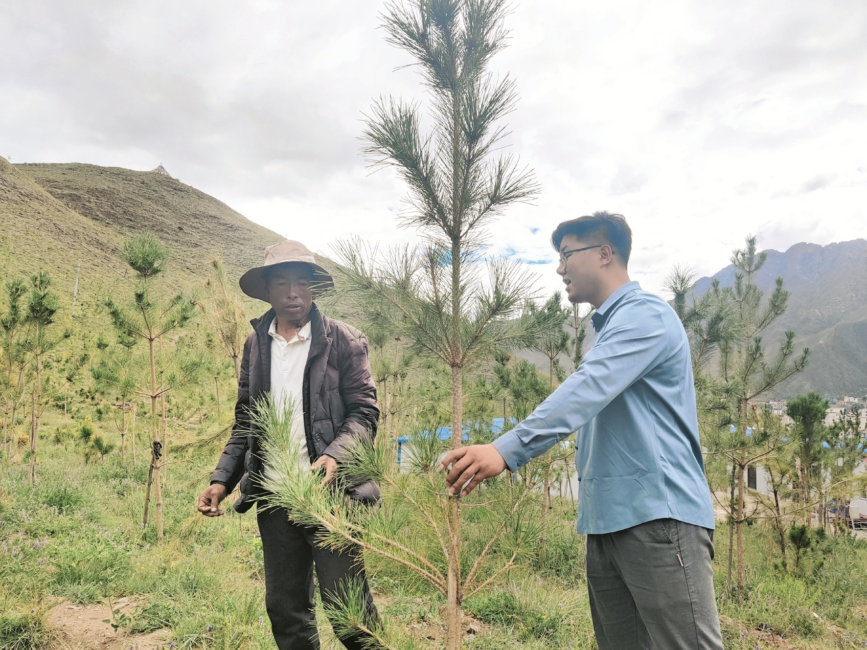 圖為在南北山綠化慈覺林1-1號片區(qū),工作人員正在查看苗木長勢。拉薩融媒記者 余洋洋攝