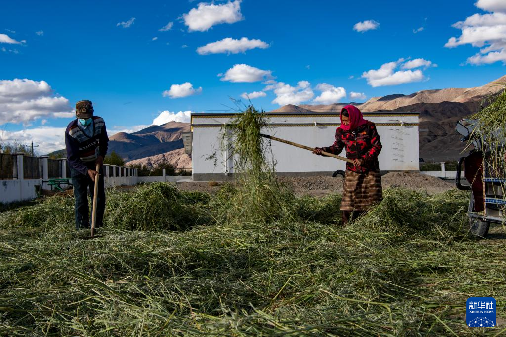 阿里地區(qū)噶爾縣昆莎鄉(xiāng)噶爾新村村民在場(chǎng)院晾曬紫花苜蓿(9月20日攝)。新華社記者 姜帆 攝