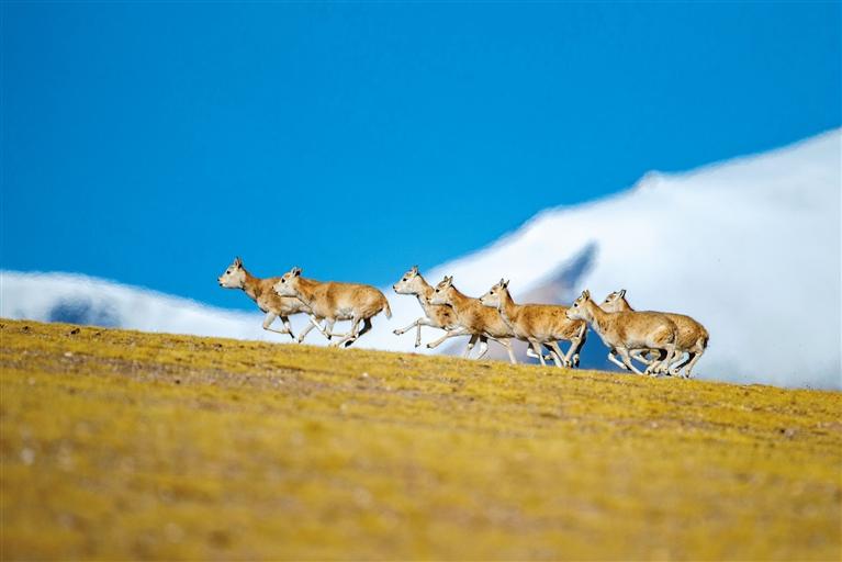 圖為在羌塘國家級自然保護區(qū),一群雌性藏羚羊在奔跑。新華社記者 姜帆 攝