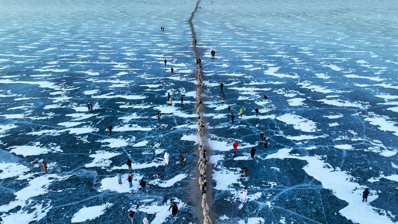 去往湖心島的路程大約3公里,走在冰面上,偶爾響起的冰層破裂聲還是讓人不由得心驚。此刻,幾百只羊宛如一條長長的直線,在牧羊人的指揮下緩慢前行。金色的太陽露出地平線,羊群的影子投射在藍色的冰面上,美不勝收。