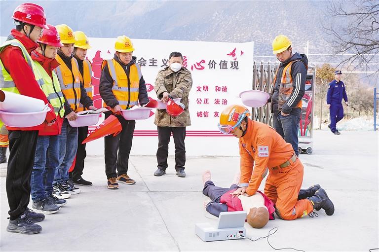 圖為林芝市森林消防支隊(duì)培訓(xùn)隊(duì)員為中鐵職工講解心肺復(fù)蘇知識。