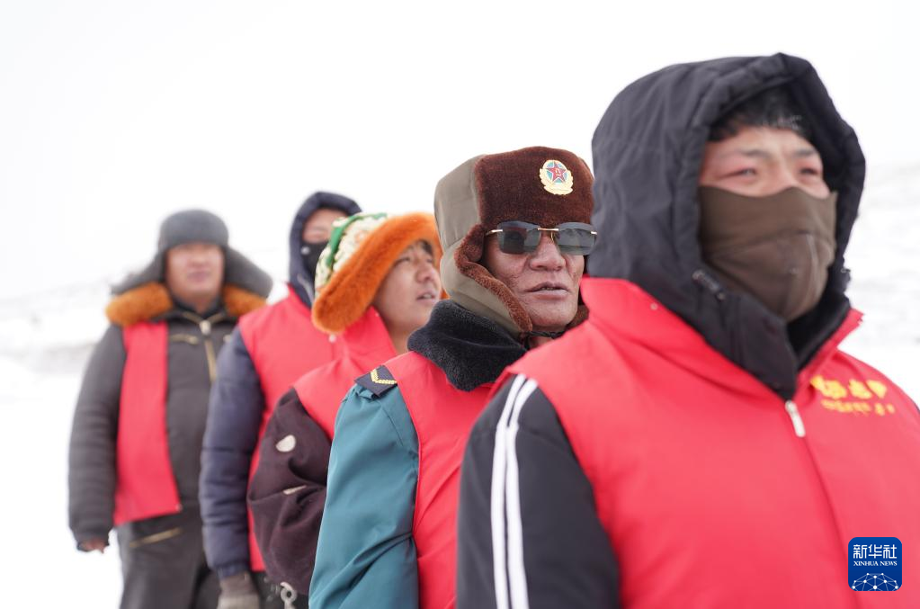 瑪曲鄉(xiāng)長江源黨員環(huán)保志愿隊年近七旬的才嘎老人(左二)在巡邏守護(hù)長江源(2024年2月2日攝)。新華社記者 晉美多吉 攝