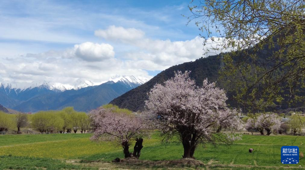 燦若云霞的桃花和潔白無瑕的雪山交織成一幅獨(dú)特的雪域高原美景(3月30日攝)。新華社記者 丁增尼達(dá) 攝
