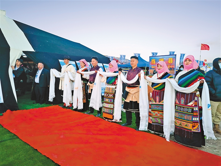 開湖意味著旅游旺季的到來。當(dāng)雄縣、尼木縣、曲水縣、城關(guān)區(qū)等縣區(qū)都搭起彩色帳篷,展示特色美食、文創(chuàng)產(chǎn)品和非遺文化。各縣區(qū)的文旅局長們集體“出攤”,向來賓做著熱情細(xì)致的宣介。林周縣的帳篷前,4位藏族農(nóng)牧民跳起舞蹈,這是從夯墻勞作中誕生的傳統(tǒng)舞蹈“阿嘎舞”;達(dá)孜區(qū)展出青稞精釀白啤酒、以黑頸鶴為靈感創(chuàng)作的文創(chuàng)產(chǎn)品、知名品牌的古檀香等特色商品;曲水縣在醒目位置放置著全域旅游手繪地圖、文旅產(chǎn)業(yè)招商引資項目介紹等手冊。