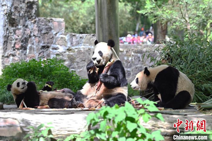 4月21日,中國大熊貓保護研究中心都江堰基地的大熊貓享用美食,憨態(tài)可掬。中新社記者 安源 攝