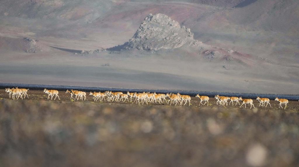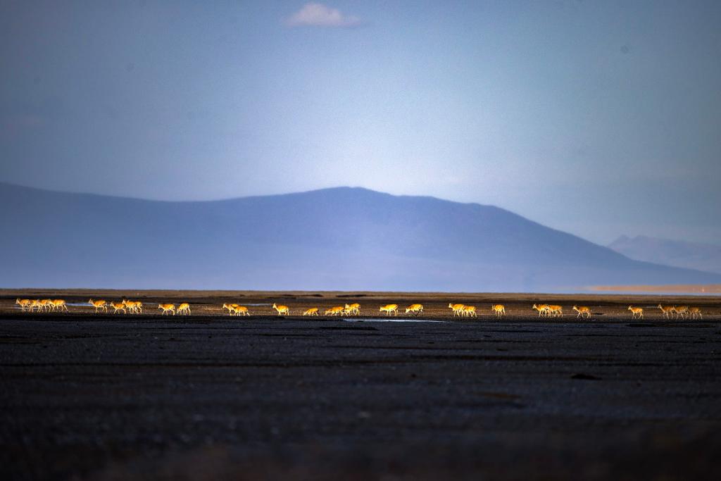 6月15日清晨在羌塘國家級(jí)自然保護(hù)區(qū)拍攝的遷徙中的母藏羚羊。