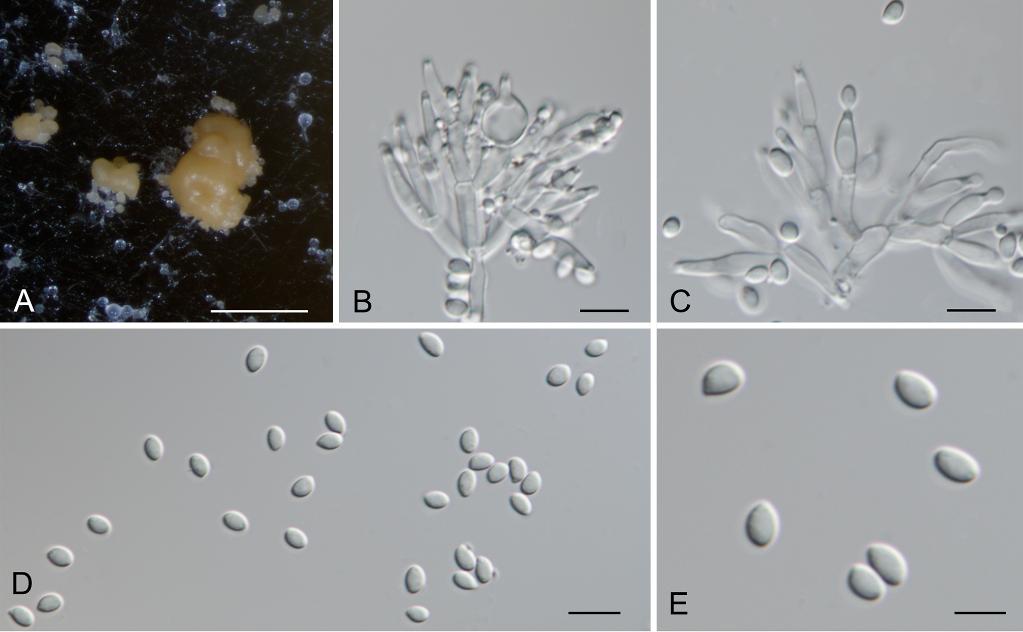 西藏螺旋聚孢霉的形態(tài)。A:PDA上形成的分生孢子團,B、C:產孢細胞及初生的分生孢子,D、E:分生孢子。標尺A=300μm;B-E=10μm。(西藏自治區(qū)生態(tài)環(huán)境廳供圖)