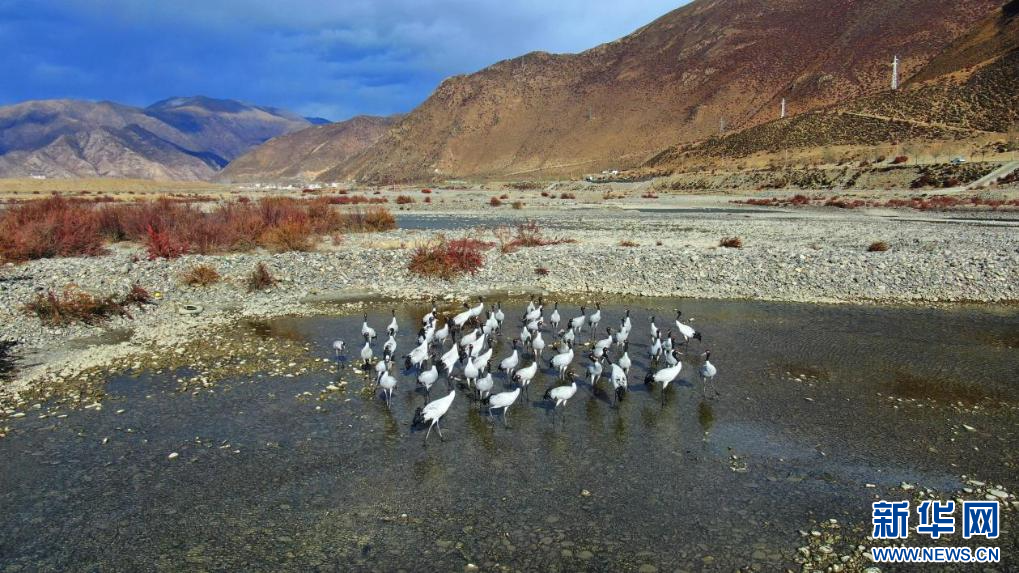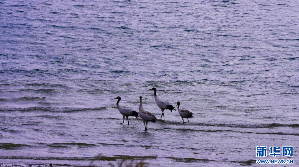 圖為岸邊的黑頸鶴(11月24日攝)。新華網(wǎng)發(fā) 嘎色攝