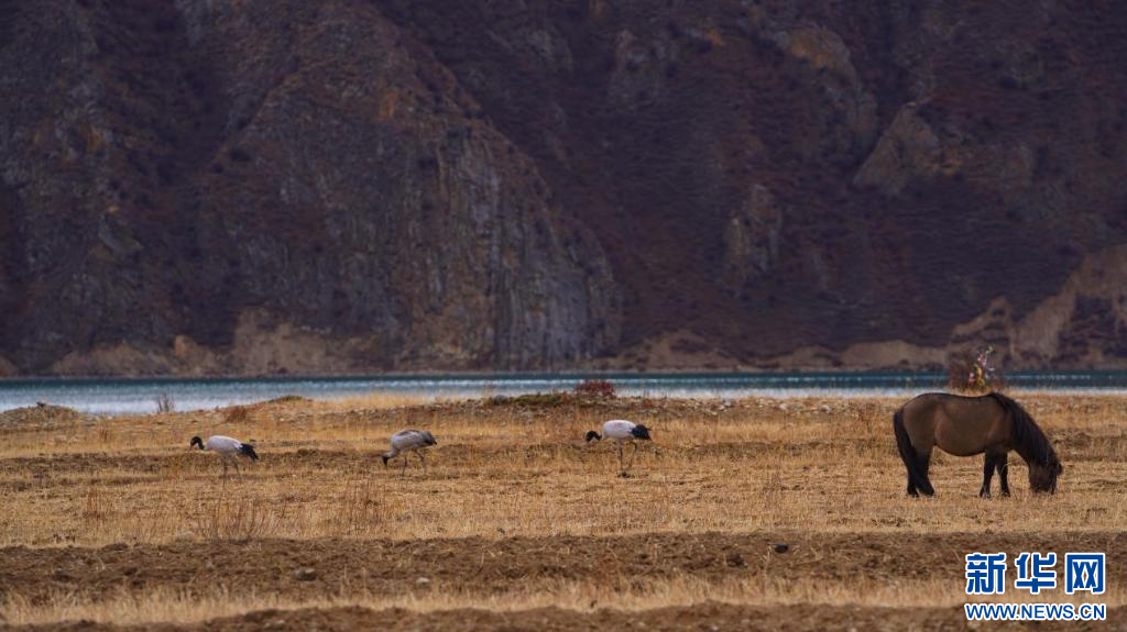 圖為湖邊的黑頸鶴與牦牛(11月24日攝)。新華網(wǎng)發(fā) 嘎色攝