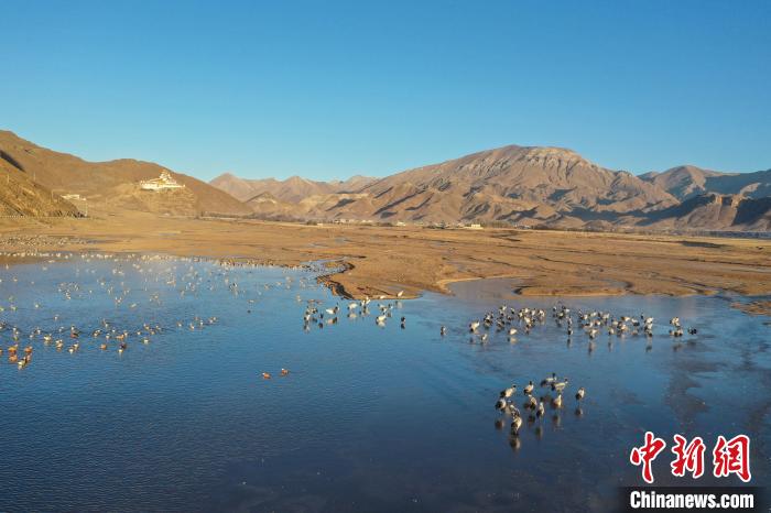 11月27日晨,西藏自治區(qū)拉薩市林周縣黑頸鶴保護區(qū)內(nèi),大量越冬的黑頸鶴在虎頭山水庫覓食、嬉戲。林周縣位于拉薩河上游及澎波河流域,平均海拔約4200米,是黑頸鶴的主要越冬地之一。中新社記者 貢嘎來松 攝