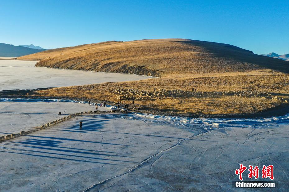 2月7日,西藏山南市浪卡子縣推瓦村1000多只羊通過普莫雍錯冰湖,前往湖心島。據(jù)悉,位于西藏山南市浪卡子縣的推瓦村,平均海拔約5070米,是世界上海拔最高的行政村,以牧業(yè)為主。由于推瓦村海拔高、夏季短,草場無法為羊群提供充足的過冬飼料,因此,每年高原最冷的時候,推瓦村牧民會把羊群趕到普莫雍錯水草豐茂的湖心島,依靠島上的草料度過最寒冷的冬期。圖為羊群到達(dá)湖心島。(無人機(jī)照片)