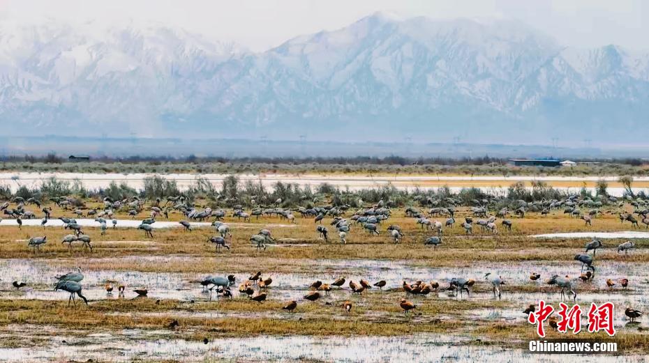 連日來,成群灰鶴聚集于青海省海西蒙古族藏族自治州都蘭縣巴隆鄉(xiāng)鐵絲蓋地區(qū)?;寅Q是國家二級重點保護野生動物。圖為灰鶴等野生鳥類群在濕地休憩。