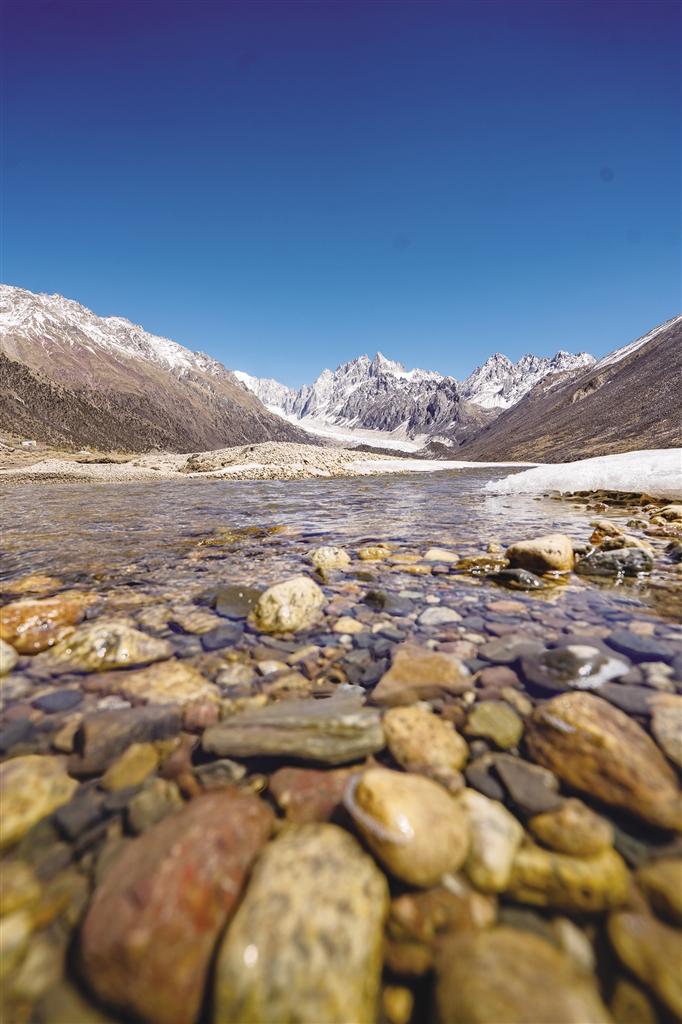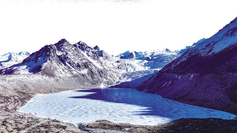 三月下旬,冰凍的湖泊已微微融化,冰面上覆著一層薄薄的冰沙,踩上去沙沙作響。布加雪山、焫茸冰川及冰川腳下的冰磧湖層層疊疊、相映成趣。冰川周邊山體的沙石裸露在外,隱約可見這座冰山在歲月中變化、侵蝕的痕跡。