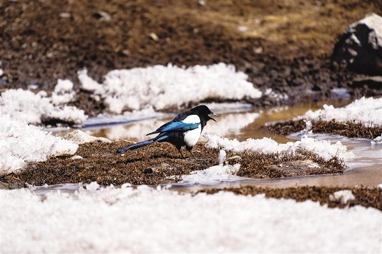 山谷內(nèi),牦牛悠然自得地吃著草,彎曲的小河縱向穿過草甸,河面還覆蓋著半邊冰殼,活水從豁口涌出,推著碎冰碴子旋轉(zhuǎn),撞擊在冰沿上發(fā)出清脆的聲響。潺潺流水聲、牛叫聲與鳥類的鳴啼交織在一起,奏響了一曲治愈的鄉(xiāng)村小調(diào)。