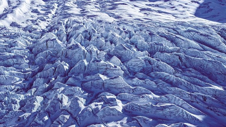 冰川突兀地橫亙在山谷中,斷裂面閃爍著冷白的光芒。冰舌邊緣布滿裂痕,表層泛著松石般的色澤,陰影處則沉淀成深邃的藍色。微風拂過冰面,一股清冷又帶著泥土芬芳的氣息撲面而來。