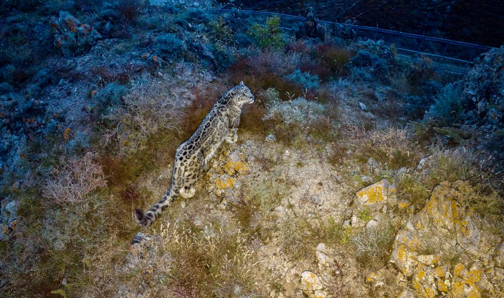 10月24日,在位于寧夏賀蘭山國(guó)家級(jí)自然保護(hù)區(qū)內(nèi)的寧夏賀蘭山雪豹保護(hù)研究基地,雪豹在進(jìn)行適應(yīng)性訓(xùn)練(無人機(jī)照片)。新華社記者 楊植森 攝