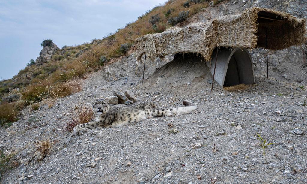 在保護(hù)區(qū)內(nèi)的雪豹保護(hù)研究基地,一座依山而建的訓(xùn)練場(chǎng)中,有兩只雪豹正在進(jìn)行適應(yīng)性訓(xùn)練。圍欄沿山勢(shì)起伏而建,山上專門開挖了巖石洞穴。上午時(shí)分,監(jiān)控畫面顯示這兩只雪豹正在洞中休憩。