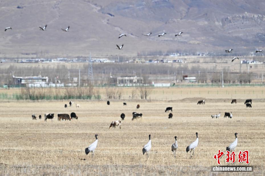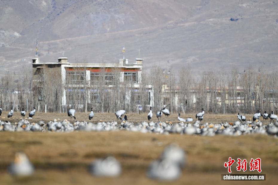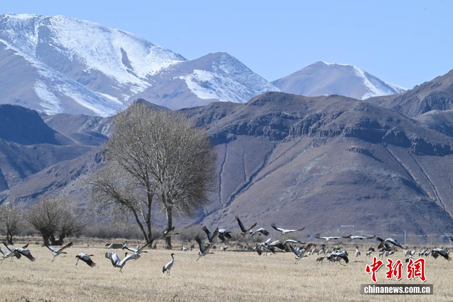 11月26日,位于西藏自治區(qū)拉薩市林周縣的黑頸鶴自然保護(hù)區(qū)內(nèi),大量越冬的黑頸鶴在卡孜水庫、農(nóng)田、濕地里覓食、嬉戲。林周縣位于拉薩河上游及澎波河流域,是黑頸鶴的主要越冬地之一。中新社記者 貢嘎來松 攝