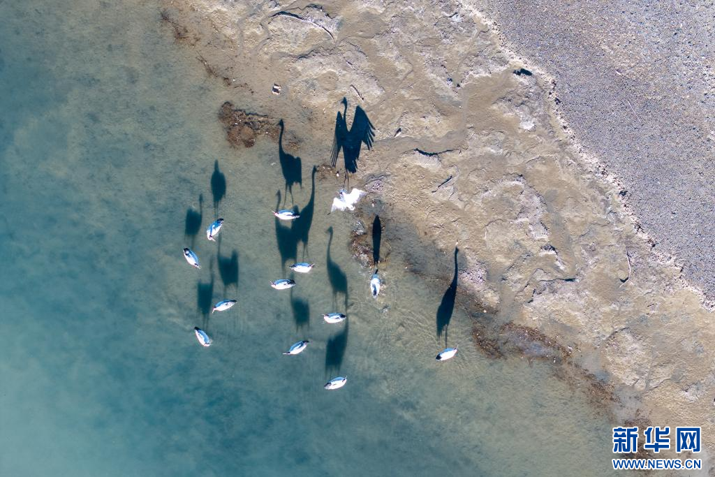 12月19日,在西藏日喀則市南木林縣的雅魯藏布江河畔拍攝的黑頸鶴(無(wú)人機(jī)照片)。新華網(wǎng) 旦增努布 攝