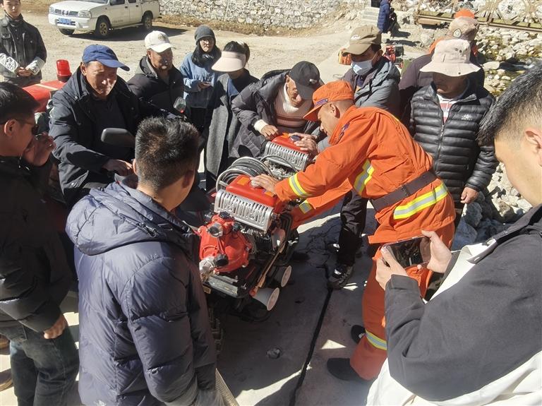 在山地水泵架設與撤收等核心實操環(huán)節(jié),消防救援人員結合當?shù)厣降仄鸱?、坡度較大的地形特征,現(xiàn)場演示管帶鋪設技巧、水泵啟動流程、壓力調節(jié)要點,并針對參訓人員提出的“水泵故障應急處置”“復雜地形下管帶防纏繞技巧”“緊急避險撤離路線選擇原則”等實際問題逐一解答。參訓人員全程專注投入,主動參與實操演練,相互交流學習心得,現(xiàn)場形成“比學趕超”的濃厚氛圍,確保每一項技能要點都學深悟透、練熟用活。